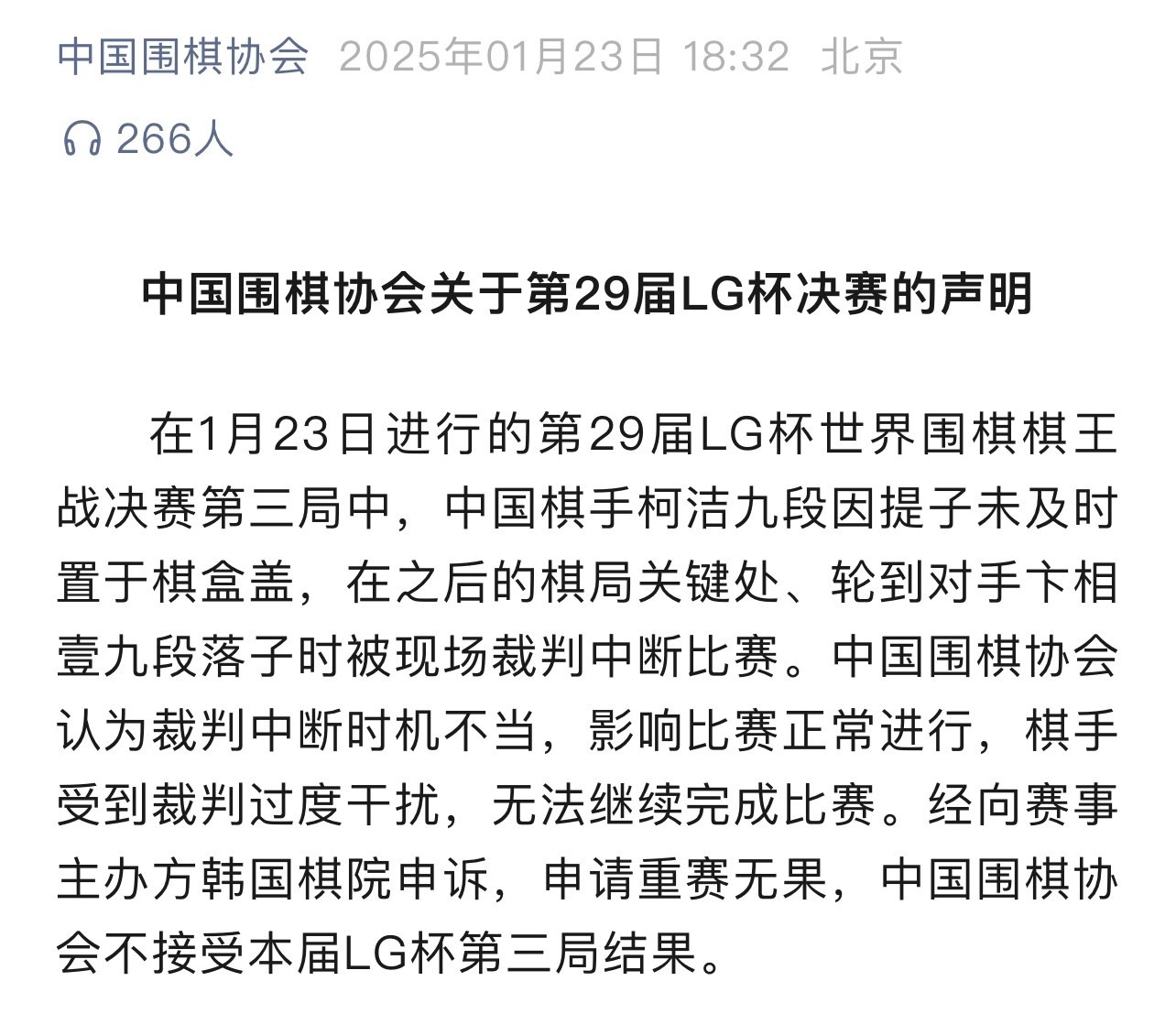 中国围棋协会随后发布声明,表示不接受第三局比赛结果。声明称:“在1月23日进行的第29届LG杯世界围棋棋王战决赛第三局中,中国棋手柯洁九段因提子未及时置于棋盒盖,在之后的棋局关键处、轮到对手卞相壹九段落子时被现场裁判中断比赛。中国围棋协会认为裁判中断时机不当,影响比赛正常进行,棋手受到裁判过度干扰,无法继续完成比赛。经向赛事主办方韩国棋院申诉,申请重赛无果,中国围棋协会不接受本届LG杯第三局结果。”